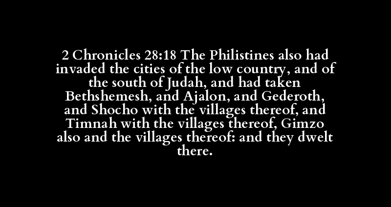 2 Chronicles 28:18 The Philistines also had invaded the cities of the low country, and of the south of Judah, and had taken Bethshemesh, and Ajalon, and Gederoth, and Shocho with the villages thereof, and Timnah with the villages thereof, Gimzo also and the villages thereof: and they dwelt there.