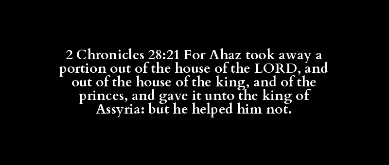 2 Chronicles 28:21 For Ahaz took away a portion out of the house of the LORD, and out of the house of the king, and of the princes, and gave it unto the king of Assyria: but he helped him not.
