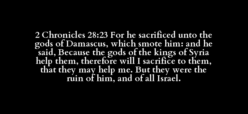 2 Chronicles 28:23 For he sacrificed unto the gods of Damascus, which smote him: and he said, Because the gods of the kings of Syria help them, therefore will I sacrifice to them, that they may help me. But they were the ruin of him, and of all Israel.