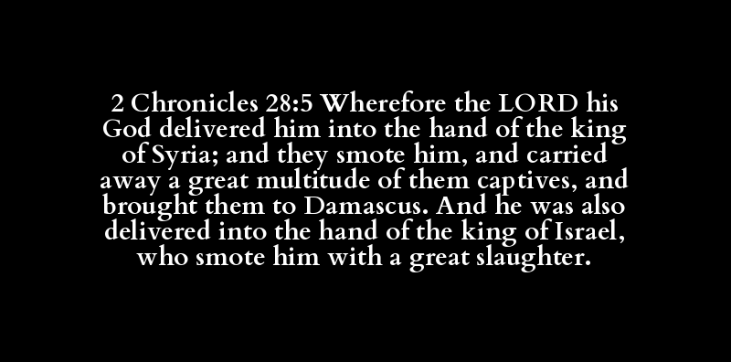 2 Chronicles 28:5 Wherefore the LORD his God delivered him into the hand of the king of Syria; and they smote him, and carried away a great multitude of them captives, and brought them to Damascus. And he was also delivered into the hand of the king of Israel, who smote him with a great slaughter.