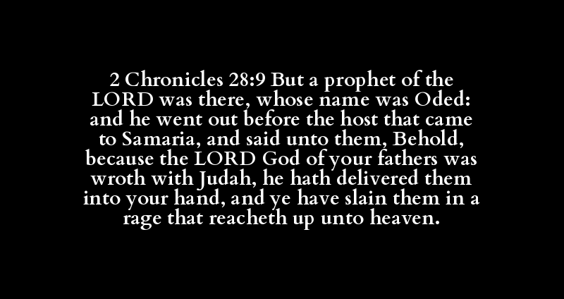 2 Chronicles 28:9 But a prophet of the LORD was there, whose name was Oded: and he went out before the host that came to Samaria, and said unto them, Behold, because the LORD God of your fathers was wroth with Judah, he hath delivered them into your hand, and ye have slain them in a rage that reacheth up unto heaven.