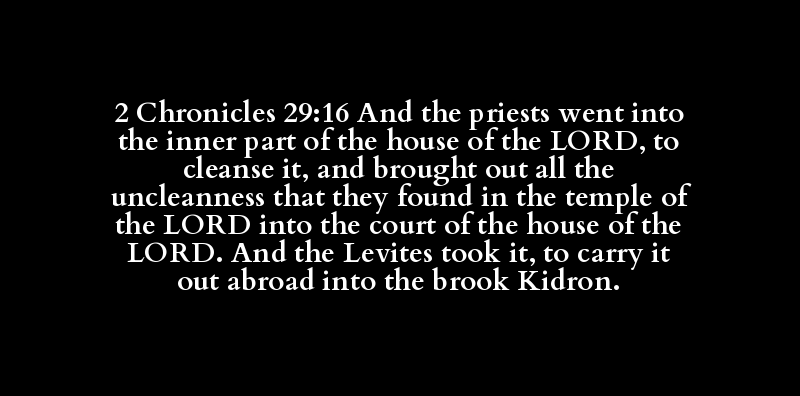 2 Chronicles 29:16 And the priests went into the inner part of the house of the LORD, to cleanse it, and brought out all the uncleanness that they found in the temple of the LORD into the court of the house of the LORD. And the Levites took it, to carry it out abroad into the brook Kidron.