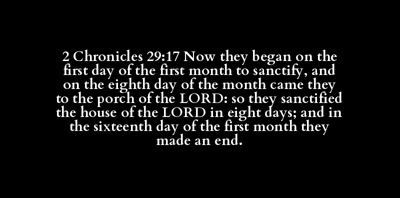 2 Chronicles 29:17 Now they began on the first day of the first month to sanctify, and on the eighth day of the month came they to the porch of the LORD: so they sanctified the house of the LORD in eight days; and in the sixteenth day of the first month they made an end.