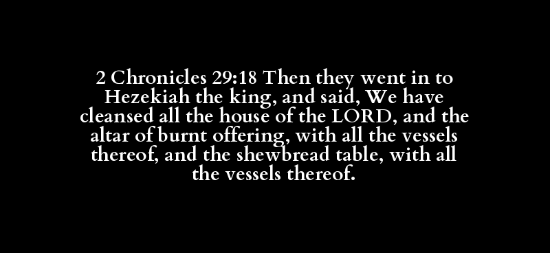 2 Chronicles 29:18 Then they went in to Hezekiah the king, and said, We have cleansed all the house of the LORD, and the altar of burnt offering, with all the vessels thereof, and the shewbread table, with all the vessels thereof.