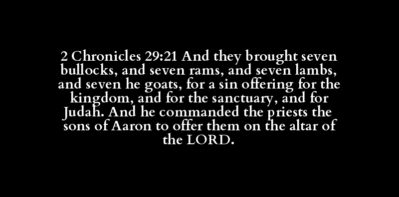 2 Chronicles 29:21 And they brought seven bullocks, and seven rams, and seven lambs, and seven he goats, for a sin offering for the kingdom, and for the sanctuary, and for Judah. And he commanded the priests the sons of Aaron to offer them on the altar of the LORD.