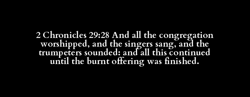 2 Chronicles 29:28 And all the congregation worshipped, and the singers sang, and the trumpeters sounded: and all this continued until the burnt offering was finished.