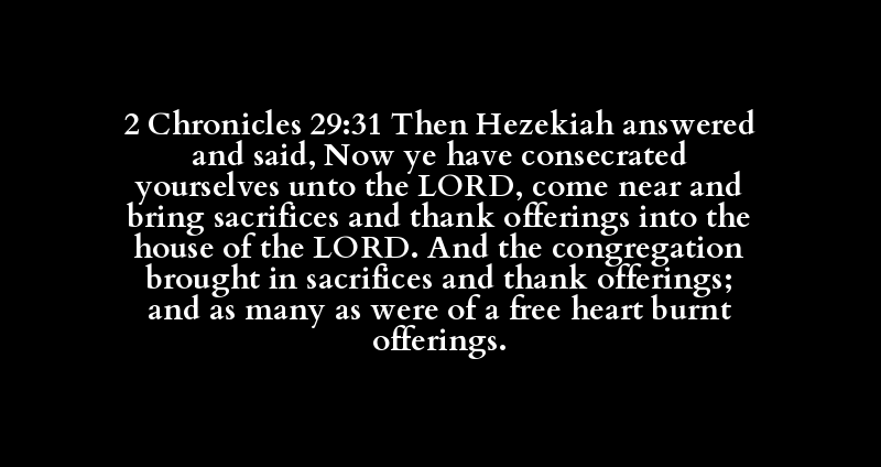 2 Chronicles 29:31 Then Hezekiah answered and said, Now ye have consecrated yourselves unto the LORD, come near and bring sacrifices and thank offerings into the house of the LORD. And the congregation brought in sacrifices and thank offerings; and as many as were of a free heart burnt offerings.