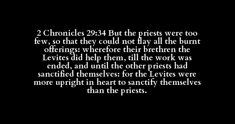2 Chronicles 29:34 But the priests were too few, so that they could not flay all the burnt offerings: wherefore their brethren the Levites did help them, till the work was ended, and until the other priests had sanctified themselves: for the Levites were more upright in heart to sanctify themselves than the priests.