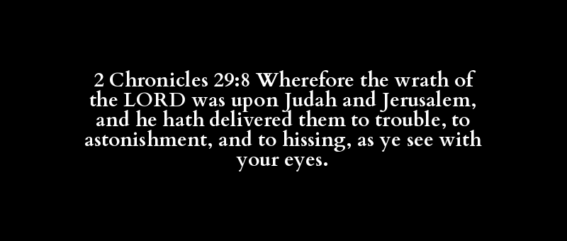 2 Chronicles 29:8 Wherefore the wrath of the LORD was upon Judah and Jerusalem, and he hath delivered them to trouble, to astonishment, and to hissing, as ye see with your eyes.