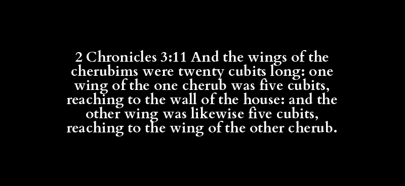 2 Chronicles 3:11 And the wings of the cherubims were twenty cubits long: one wing of the one cherub was five cubits, reaching to the wall of the house: and the other wing was likewise five cubits, reaching to the wing of the other cherub.