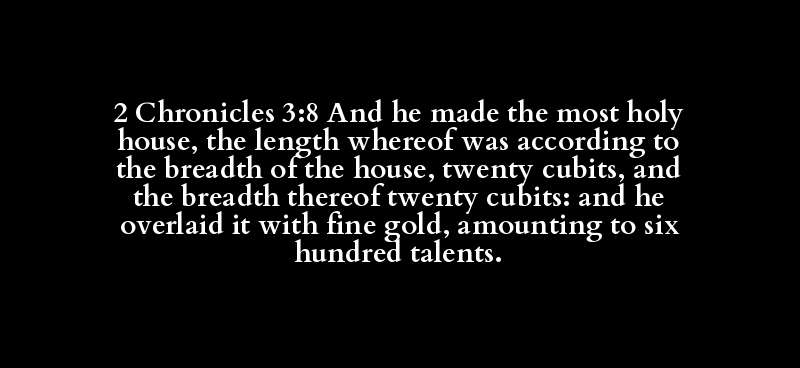 2 Chronicles 3:8 And he made the most holy house, the length whereof was according to the breadth of the house, twenty cubits, and the breadth thereof twenty cubits: and he overlaid it with fine gold, amounting to six hundred talents.