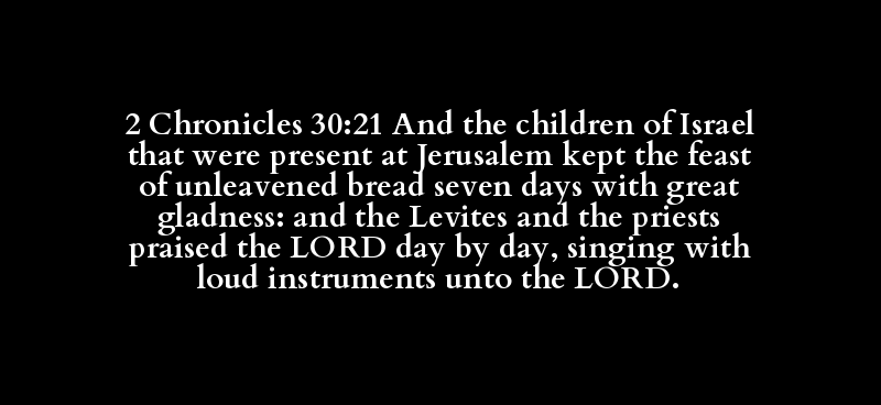 2 Chronicles 30:21 And the children of Israel that were present at Jerusalem kept the feast of unleavened bread seven days with great gladness: and the Levites and the priests praised the LORD day by day, singing with loud instruments unto the LORD.