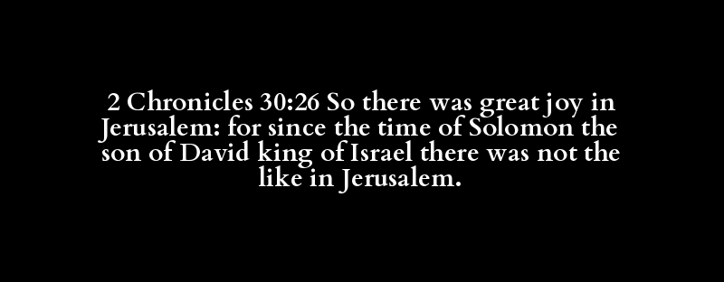 2 Chronicles 30:26 So there was great joy in Jerusalem: for since the time of Solomon the son of David king of Israel there was not the like in Jerusalem.