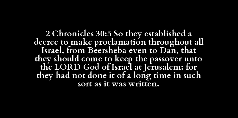 2 Chronicles 30:5 So they established a decree to make proclamation throughout all Israel, from Beersheba even to Dan, that they should come to keep the passover unto the LORD God of Israel at Jerusalem: for they had not done it of a long time in such sort as it was written.