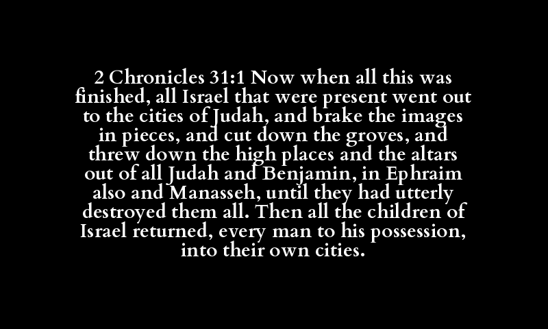 2 Chronicles 31:1 Now when all this was finished, all Israel that were present went out to the cities of Judah, and brake the images in pieces, and cut down the groves, and threw down the high places and the altars out of all Judah and Benjamin, in Ephraim also and Manasseh, until they had utterly destroyed them all. Then all the children of Israel returned, every man to his possession, into their own cities.