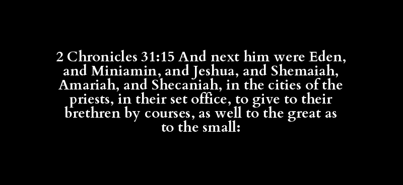 2 Chronicles 31:15 And next him were Eden, and Miniamin, and Jeshua, and Shemaiah, Amariah, and Shecaniah, in the cities of the priests, in their set office, to give to their brethren by courses, as well to the great as to the small: