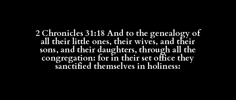2 Chronicles 31:18 And to the genealogy of all their little ones, their wives, and their sons, and their daughters, through all the congregation: for in their set office they sanctified themselves in holiness: