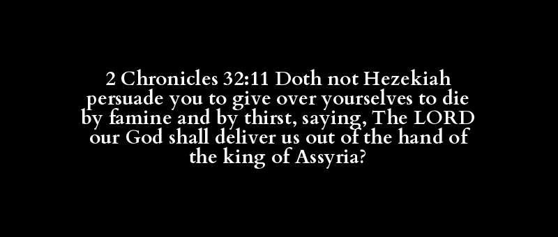 2 Chronicles 32:11 Doth not Hezekiah persuade you to give over yourselves to die by famine and by thirst, saying, The LORD our God shall deliver us out of the hand of the king of Assyria?