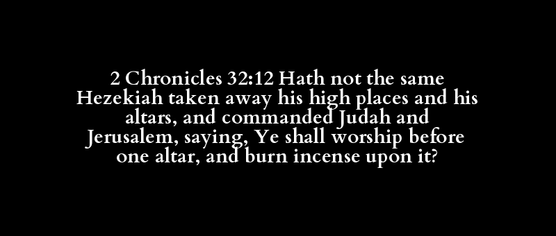 2 Chronicles 32:12 Hath not the same Hezekiah taken away his high places and his altars, and commanded Judah and Jerusalem, saying, Ye shall worship before one altar, and burn incense upon it?