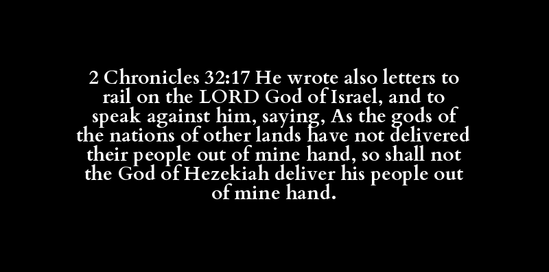 2 Chronicles 32:17 He wrote also letters to rail on the LORD God of Israel, and to speak against him, saying, As the gods of the nations of other lands have not delivered their people out of mine hand, so shall not the God of Hezekiah deliver his people out of mine hand.