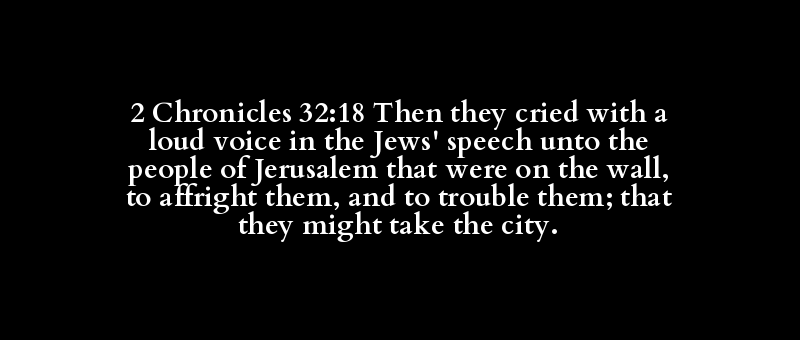 2 Chronicles 32:18 Then they cried with a loud voice in the Jews' speech unto the people of Jerusalem that were on the wall, to affright them, and to trouble them; that they might take the city.