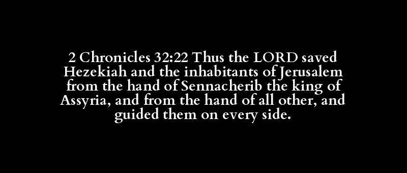 2 Chronicles 32:22 Thus the LORD saved Hezekiah and the inhabitants of Jerusalem from the hand of Sennacherib the king of Assyria, and from the hand of all other, and guided them on every side.