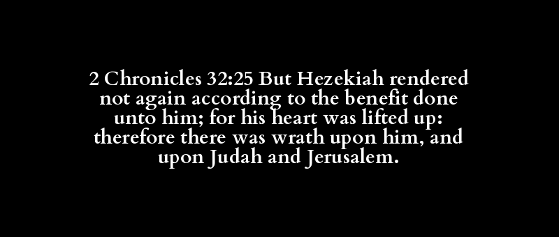 2 Chronicles 32:25 But Hezekiah rendered not again according to the benefit done unto him; for his heart was lifted up: therefore there was wrath upon him, and upon Judah and Jerusalem.