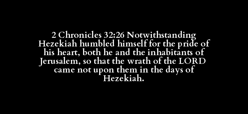2 Chronicles 32:26 Notwithstanding Hezekiah humbled himself for the pride of his heart, both he and the inhabitants of Jerusalem, so that the wrath of the LORD came not upon them in the days of Hezekiah.
