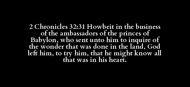 2 Chronicles 32:31 Howbeit in the business of the ambassadors of the princes of Babylon, who sent unto him to inquire of the wonder that was done in the land, God left him, to try him, that he might know all that was in his heart.