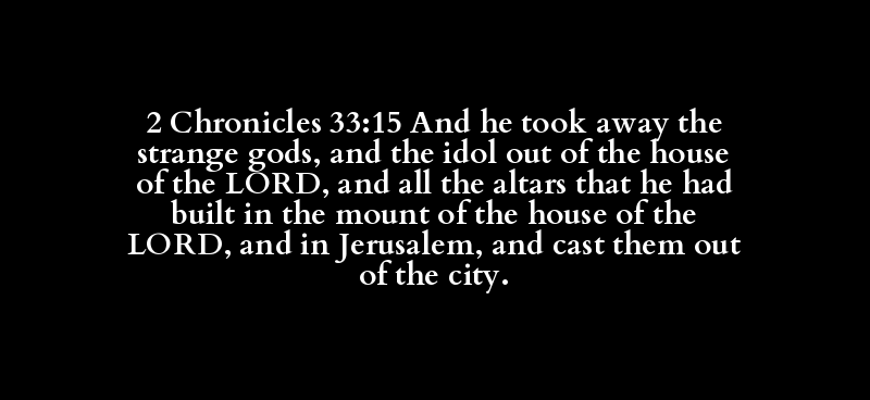 2 Chronicles 33:15 And he took away the strange gods, and the idol out of the house of the LORD, and all the altars that he had built in the mount of the house of the LORD, and in Jerusalem, and cast them out of the city.