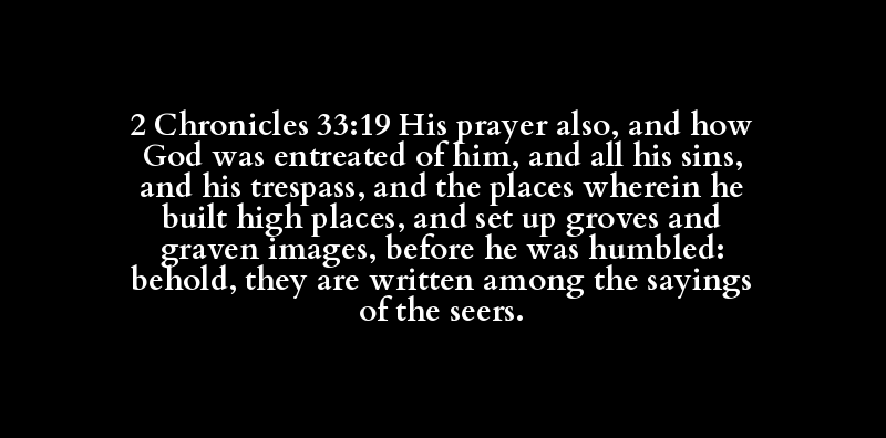 2 Chronicles 33:19 His prayer also, and how God was entreated of him, and all his sins, and his trespass, and the places wherein he built high places, and set up groves and graven images, before he was humbled: behold, they are written among the sayings of the seers.