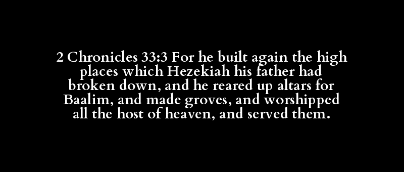 2 Chronicles 33:3 For he built again the high places which Hezekiah his father had broken down, and he reared up altars for Baalim, and made groves, and worshipped all the host of heaven, and served them.