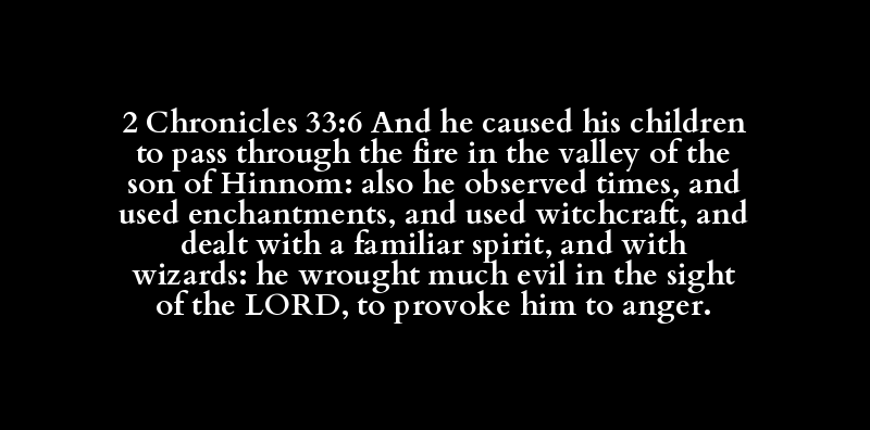 2 Chronicles 33:6 And he caused his children to pass through the fire in the valley of the son of Hinnom: also he observed times, and used enchantments, and used witchcraft, and dealt with a familiar spirit, and with wizards: he wrought much evil in the sight of the LORD, to provoke him to anger.