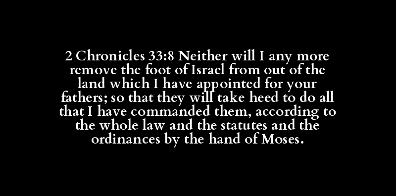 2 Chronicles 33:8 Neither will I any more remove the foot of Israel from out of the land which I have appointed for your fathers; so that they will take heed to do all that I have commanded them, according to the whole law and the statutes and the ordinances by the hand of Moses.