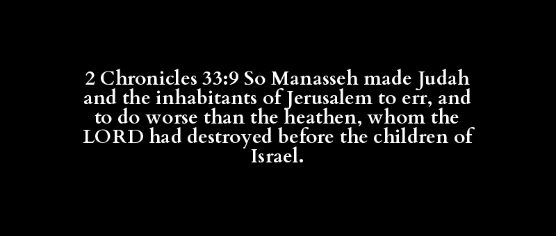 2 Chronicles 33:9 So Manasseh made Judah and the inhabitants of Jerusalem to err, and to do worse than the heathen, whom the LORD had destroyed before the children of Israel.