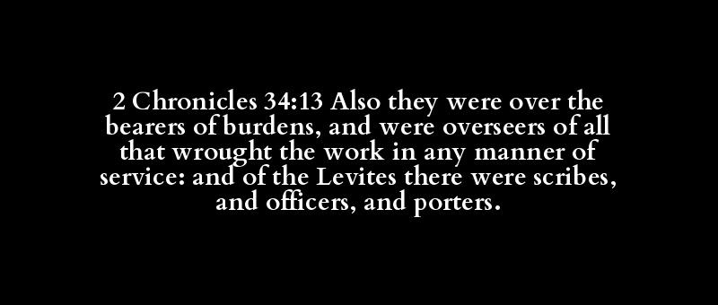 2 Chronicles 34:13 Also they were over the bearers of burdens, and were overseers of all that wrought the work in any manner of service: and of the Levites there were scribes, and officers, and porters.