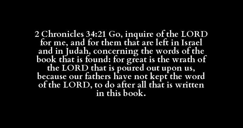 2 Chronicles 34:21 Go, inquire of the LORD for me, and for them that are left in Israel and in Judah, concerning the words of the book that is found: for great is the wrath of the LORD that is poured out upon us, because our fathers have not kept the word of the LORD, to do after all that is written in this book.