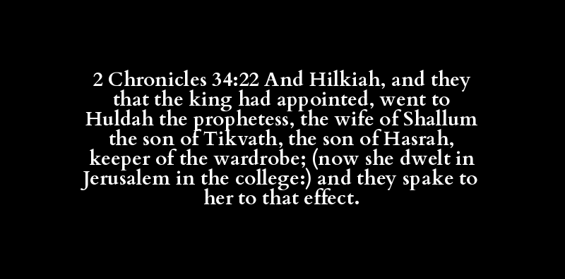 2 Chronicles 34:22 And Hilkiah, and they that the king had appointed, went to Huldah the prophetess, the wife of Shallum the son of Tikvath, the son of Hasrah, keeper of the wardrobe; (now she dwelt in Jerusalem in the college:) and they spake to her to that effect.