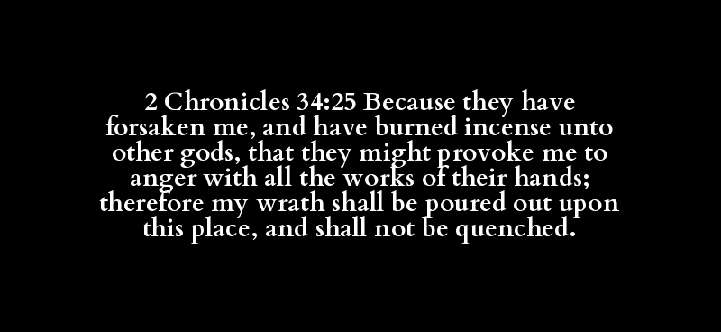2 Chronicles 34:25 Because they have forsaken me, and have burned incense unto other gods, that they might provoke me to anger with all the works of their hands; therefore my wrath shall be poured out upon this place, and shall not be quenched.