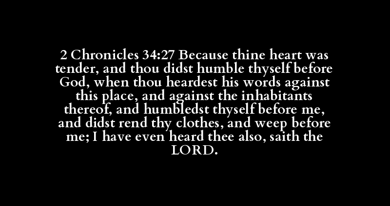 2 Chronicles 34:27 Because thine heart was tender, and thou didst humble thyself before God, when thou heardest his words against this place, and against the inhabitants thereof, and humbledst thyself before me, and didst rend thy clothes, and weep before me; I have even heard thee also, saith the LORD.