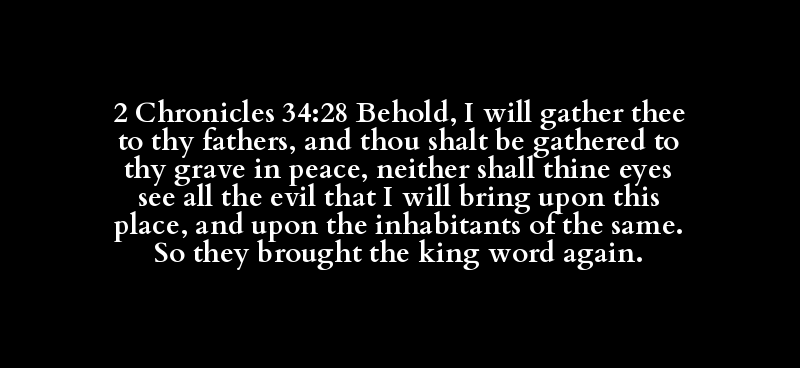 2 Chronicles 34:28 Behold, I will gather thee to thy fathers, and thou shalt be gathered to thy grave in peace, neither shall thine eyes see all the evil that I will bring upon this place, and upon the inhabitants of the same. So they brought the king word again.