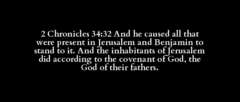 2 Chronicles 34:32 And he caused all that were present in Jerusalem and Benjamin to stand to it. And the inhabitants of Jerusalem did according to the covenant of God, the God of their fathers.