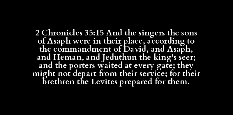 2 Chronicles 35:15 And the singers the sons of Asaph were in their place, according to the commandment of David, and Asaph, and Heman, and Jeduthun the king's seer; and the porters waited at every gate; they might not depart from their service; for their brethren the Levites prepared for them.