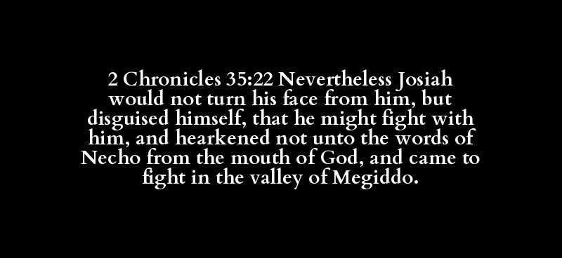 2 Chronicles 35:22 Nevertheless Josiah would not turn his face from him, but disguised himself, that he might fight with him, and hearkened not unto the words of Necho from the mouth of God, and came to fight in the valley of Megiddo.