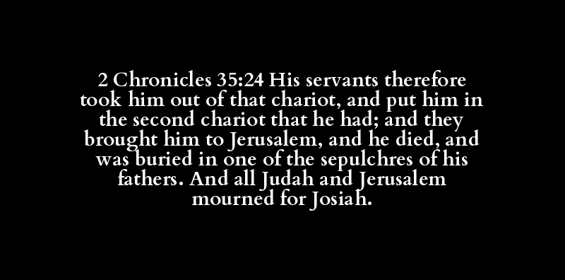 2 Chronicles 35:24 His servants therefore took him out of that chariot, and put him in the second chariot that he had; and they brought him to Jerusalem, and he died, and was buried in one of the sepulchres of his fathers. And all Judah and Jerusalem mourned for Josiah.