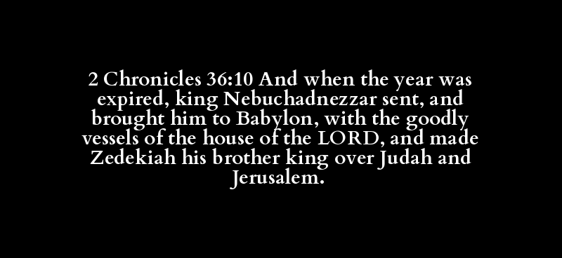 2 Chronicles 36:10 And when the year was expired, king Nebuchadnezzar sent, and brought him to Babylon, with the goodly vessels of the house of the LORD, and made Zedekiah his brother king over Judah and Jerusalem.