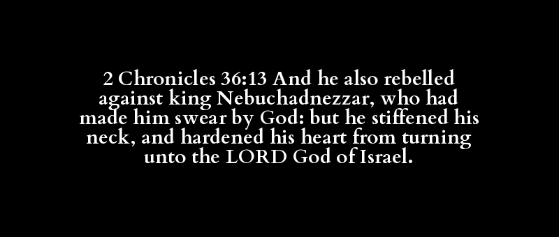 2 Chronicles 36:13 And he also rebelled against king Nebuchadnezzar, who had made him swear by God: but he stiffened his neck, and hardened his heart from turning unto the LORD God of Israel.