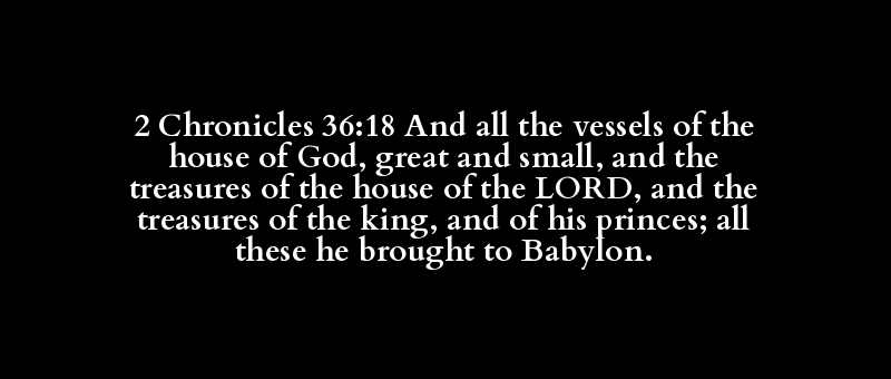 2 Chronicles 36:18 And all the vessels of the house of God, great and small, and the treasures of the house of the LORD, and the treasures of the king, and of his princes; all these he brought to Babylon.