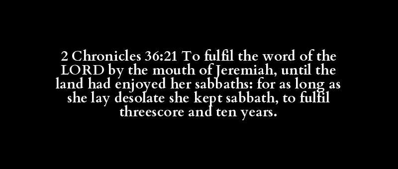 2 Chronicles 36:21 To fulfil the word of the LORD by the mouth of Jeremiah, until the land had enjoyed her sabbaths: for as long as she lay desolate she kept sabbath, to fulfil threescore and ten years.