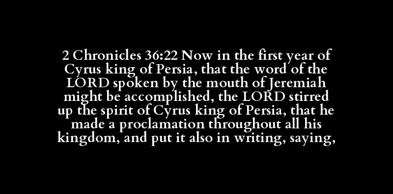 2 Chronicles 36:22 Now in the first year of Cyrus king of Persia, that the word of the LORD spoken by the mouth of Jeremiah might be accomplished, the LORD stirred up the spirit of Cyrus king of Persia, that he made a proclamation throughout all his kingdom, and put it also in writing, saying,